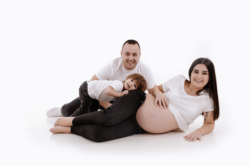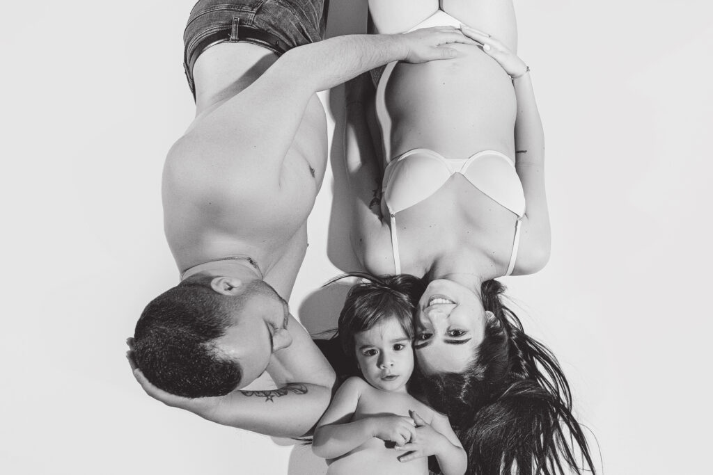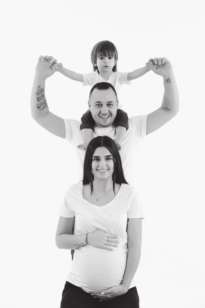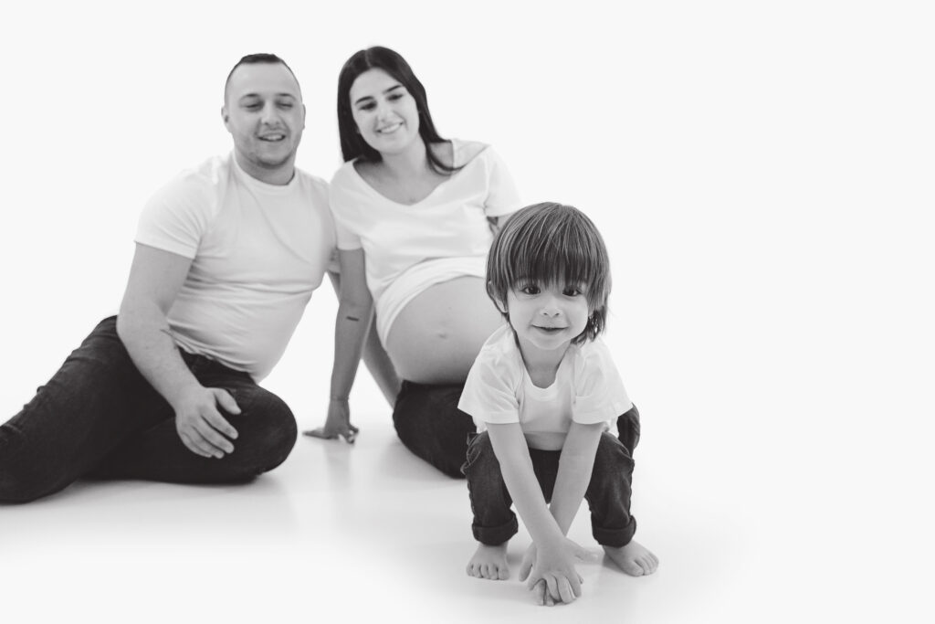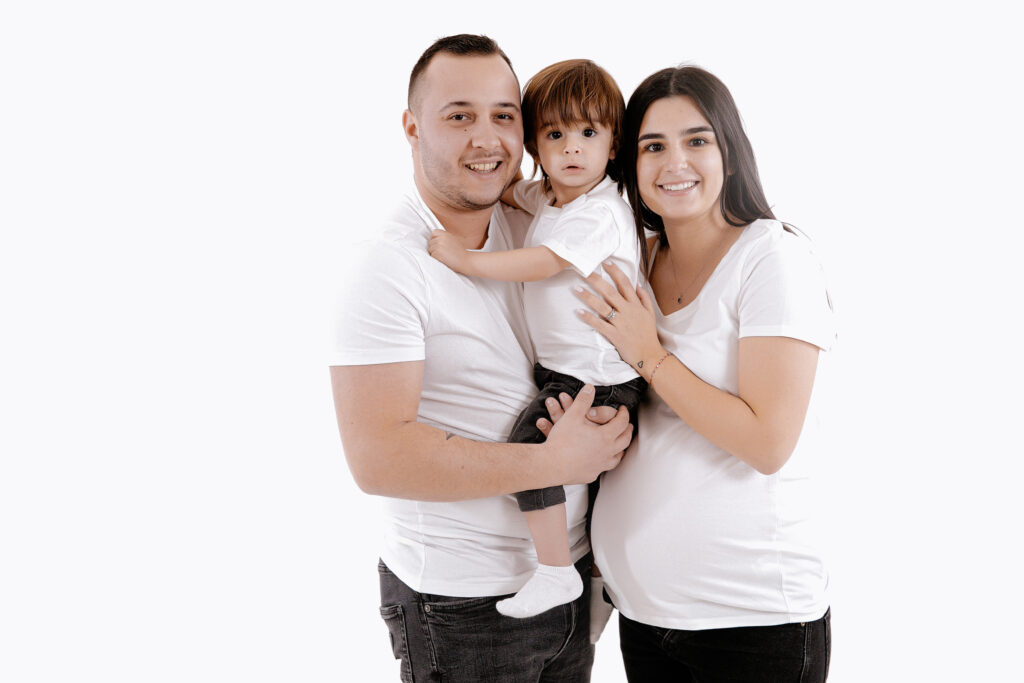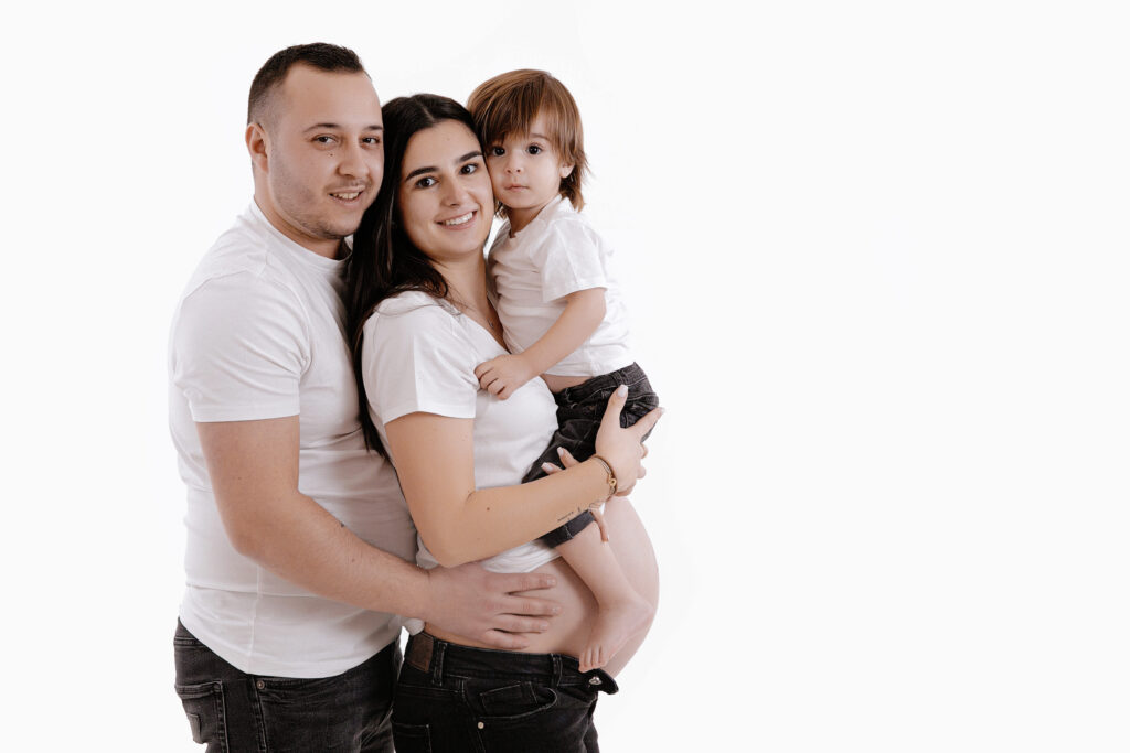 Pour les photos en famille, il est important de choisir des tenues coordonnées : le style et les couleurs font toute la différence. Vous n’êtes pas obligés de porter exactement les mêmes vêtements, mais il est plus harmonieux de choisir 2 ou 3 couleurs qui s’accordent bien entre elles. Toutes les informations nécessaires vous sont transmises après la réservation de la séance. Le photographe vous guide avant, pendant et après, afin que vous soyez accompagnés tout au long de cette belle expérience. Sur les photos présentées ici, la famille a choisi deux couleurs sobres et intemporelles : le noir et le blanc. En jouant sur le minimalisme, ils ont opté pour une tenue blanche sur fond blanc, puis torse nu sur fond gris — un résultat simple, élégant et plein d’harmonie.