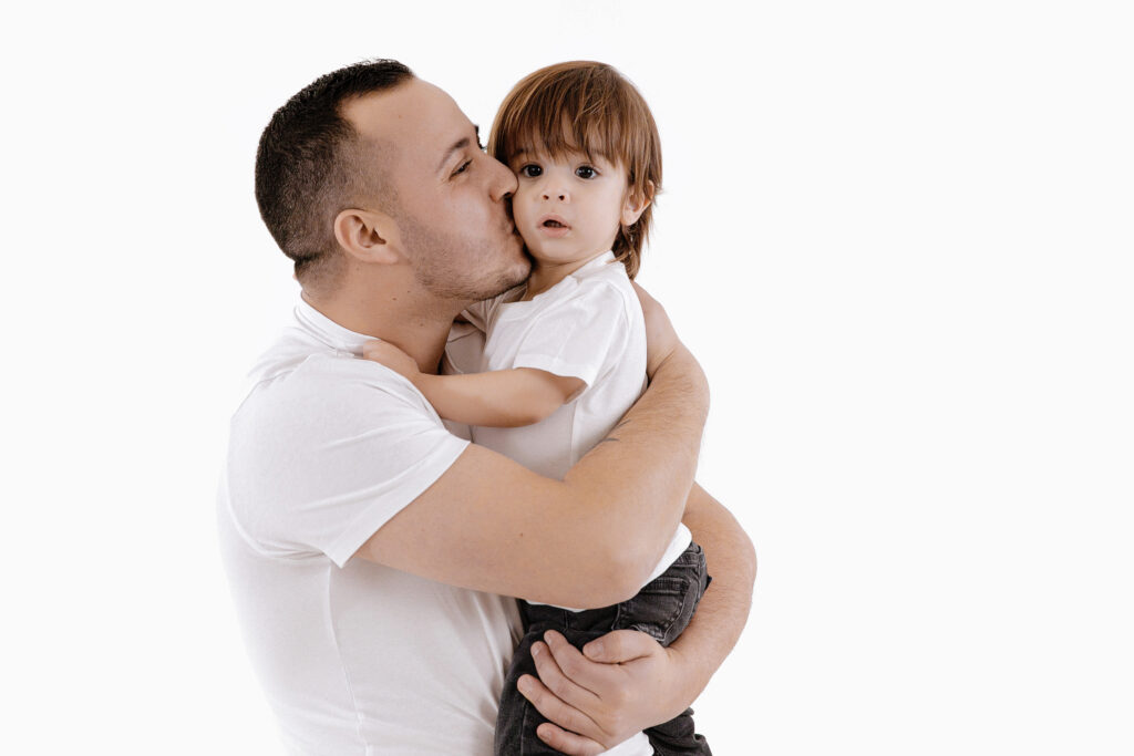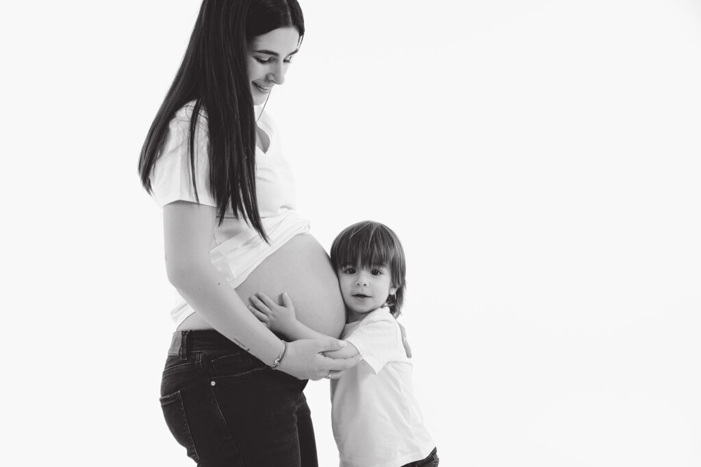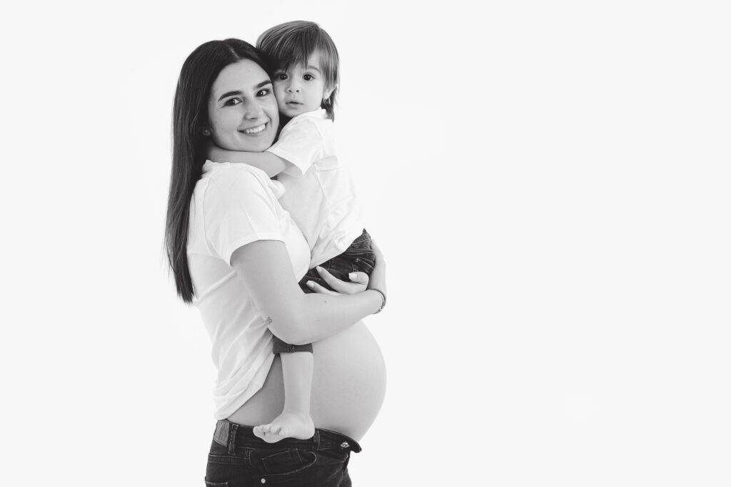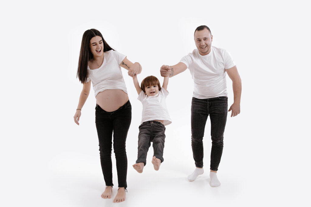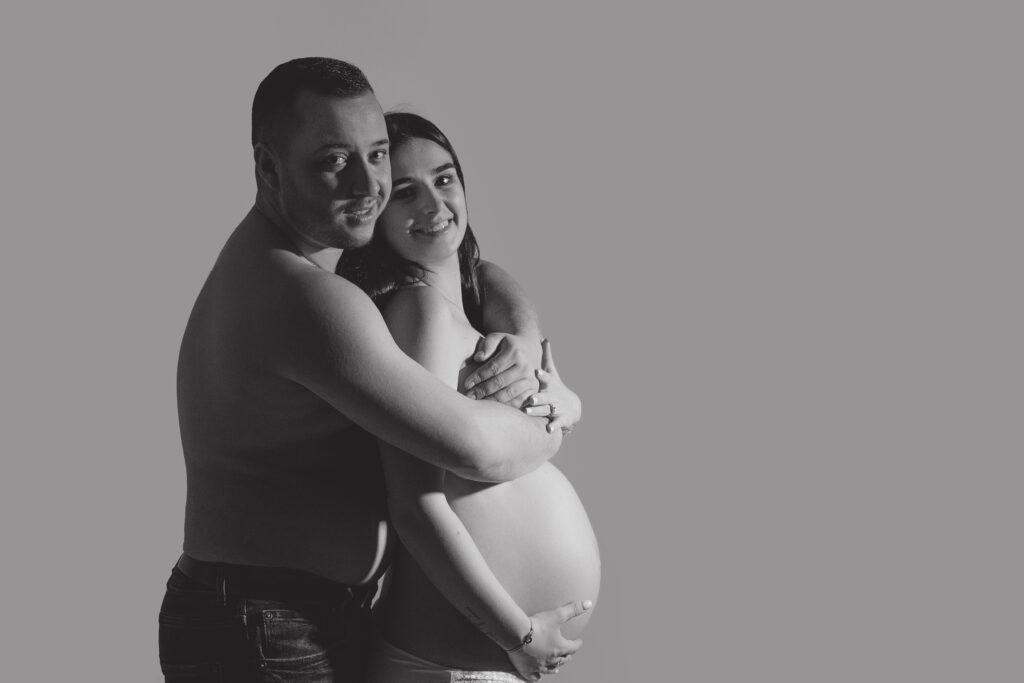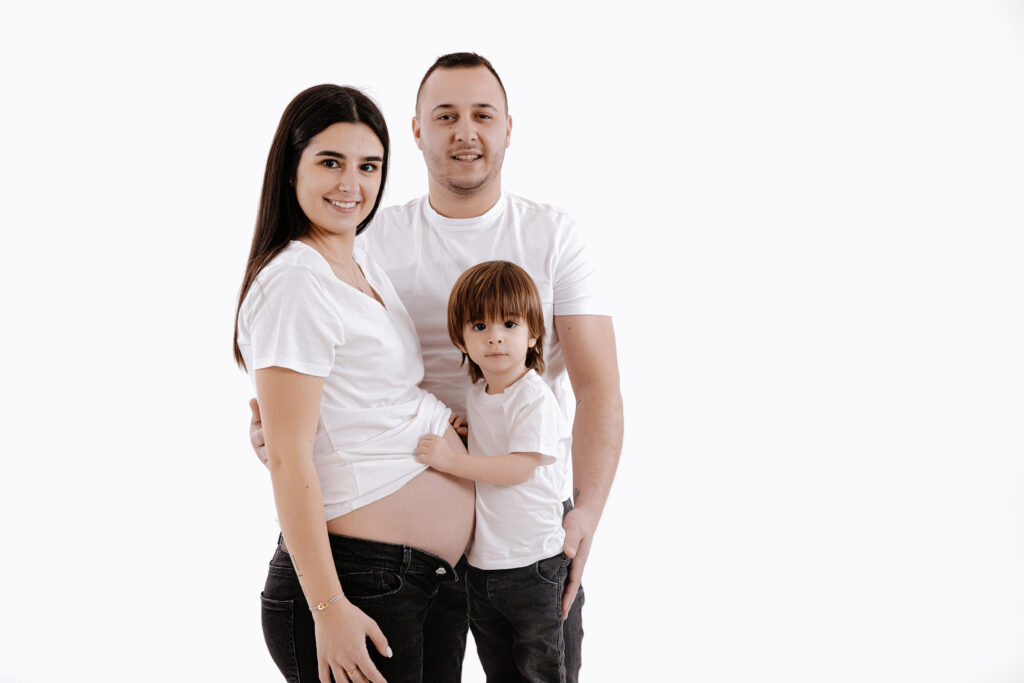 Pour les photos en famille, il est important de choisir des tenues coordonnées : le style et les couleurs font toute la différence. Vous n’êtes pas obligés de porter exactement les mêmes vêtements, mais il est plus harmonieux de choisir 2 ou 3 couleurs qui s’accordent bien entre elles. Toutes les informations nécessaires vous sont transmises après la réservation de la séance. Le photographe vous guide avant, pendant et après, afin que vous soyez accompagnés tout au long de cette belle expérience. Sur les photos présentées ici, la famille a choisi deux couleurs sobres et intemporelles : le noir et le blanc. En jouant sur le minimalisme, ils ont opté pour une tenue blanche sur fond blanc, puis torse nu sur fond gris — un résultat simple, élégant et plein d’harmonie.
