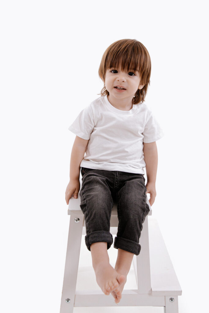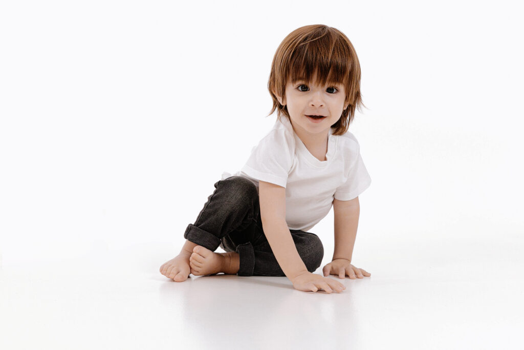 On commence toujours par les photos avec les enfants, pour profiter de leur énergie et de leur spontanéité. Les poses varient selon leur âge et leur personnalité — la plupart des enfants entre 8 et 48 mois ne posent pas vraiment, et c’est très bien ainsi ! Le photographe prend le temps de créer un vrai contact avec eux, pour que chacun se sente libre d’exprimer sa petite personnalité. La meilleure façon d’obtenir de belles photos ? Jouer avec eux, tout simplement.